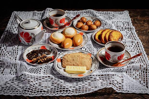 В ресторане придумали зимний ритуал, переиначив на региональный лад британский five o’clock. Для ностальгического путешествия продумано все до мельчайших деталей. Черный чай со смородиной и мятой подают в сервизе «Ноготки», выпущенном в середине 60-х годов, вместо скатерти — кружевная салфетка, а сладости те самые — советские. В сет входят гренки с сахаром, печенье со сливочным маслом, шоколадная колбаса, орешки с вареной сгущенкой и грецким орехом, пирожки с вишней и малиной, ватрушки с творогом.