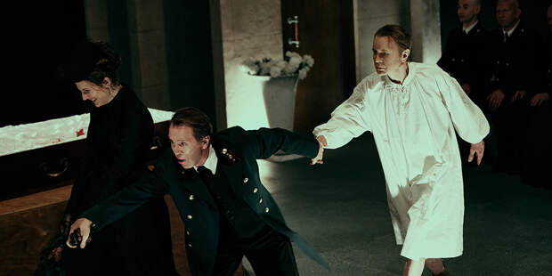 Спектакль начинается с похорон. Пространство сцены напоминает обычный зал для прощаний, куда в самый центр выкатывают большой постамент для гроба (художник Алексей Трегубов). Именно из гроба, можно сказать, из преисподней и появляется герой Иван Ильич, член Судебной палаты, имевший вполне завидное положение, недавно, после долгих лет службы в провинции, получивший назначение в Петербург и заживший, что называется, новой, счастливой, вполне сытой и приятной жизнью. И скончавшийся в 45 лет.