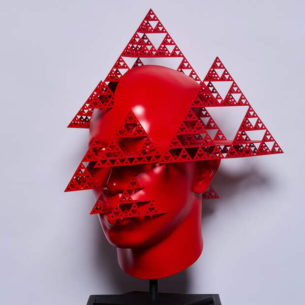 Скульптуры этой коллекции, представляющие собой головы, выполнены в красном и синем цветах — это может намекать на гендерные различия. Например, в данной работе четко прослеживается символ пирамиды, для художника — символ власти маскулинности. Однако то, что действительно привлекает внимание — их концептуальная основа, которая исследует границы между реальностью и виртуальностью, гибридностью современного мира.