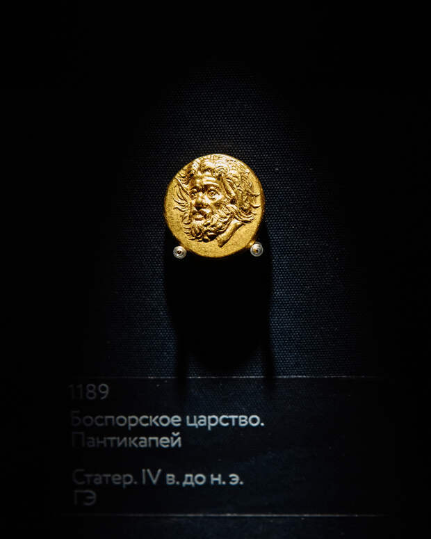 Знаменитый боспорский золотой статер IV века изображает сатира с трёхчетвертным поворотом. Обычно этих лесных божеств и демонов плодородия рисуют в профиль — иногда с венком, иногда без. Здесь же существо представлено с развевающимися волосами и торчащими ушами. Существует больше десятка таких монет, некоторые из них хранятся в Эрмитаже. Но именно этот экспонат привлекает внимание, так как он — вершина искусства резчиков Боспорского царства. В этом и заключается его ценность.