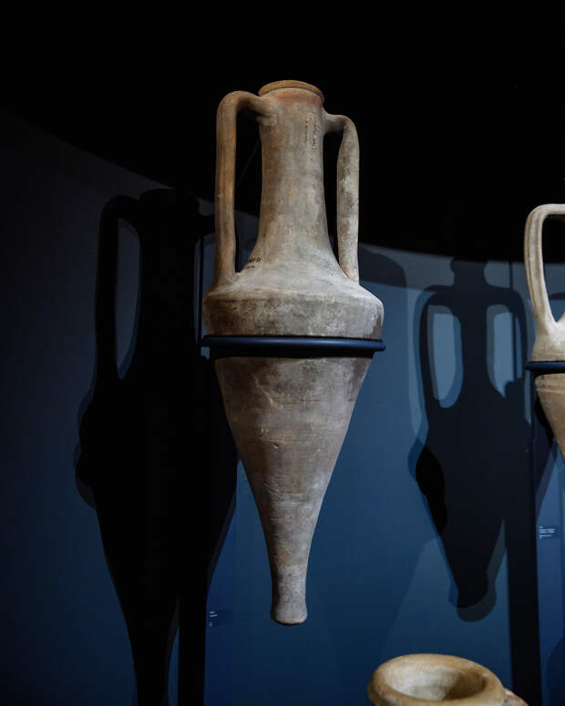 На горлышке представленной на выставке амфоры выдавлено клеймо — высокий кубок, символ Геракла. Вероятно, клейма ставили, чтобы пометить амфоры, которые государство заказывало для розлива вина с арендованных виноградников. По метке часто можно очень точно определить дату производства амфоры — иногда до десяти лет. Это как знак качества на бутылке, представляющий ценные данные для археологов.