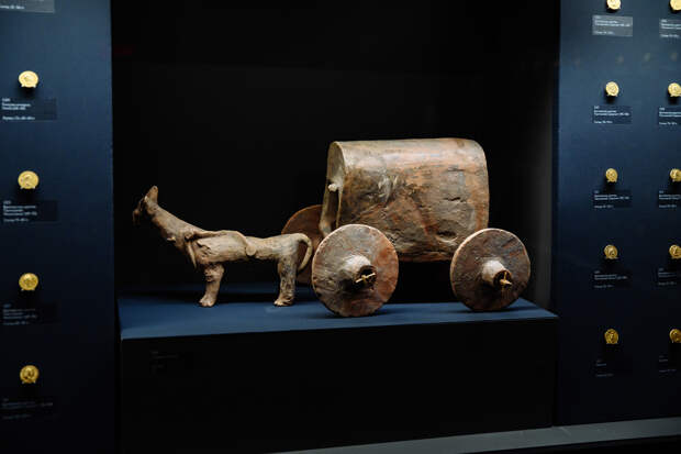 Этот экспонат редко появляется в музеях. Всего в коллекции Эрмитажа семь таких повозок, но всего их известно около десяти. Их делали греческие мастера в римское время на Боспоре. Предположительно, такие повозки ставили в могилы эллинизированные варвары. В их курганах обязательно должен был быть транспорт. Например, викинги размещали ладью, а скифы — коня. А тут варвары уже жили в городе, почти «в малогабаритной квартире», то есть в каком-то городском доме. Возможно, у них и коня не было, но была традиция, и они заказывали в греческой мастерской терракотовую фигурку и ставили её в могилу как заупокойный транспорт.