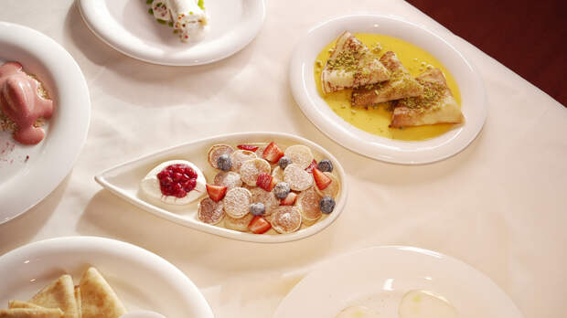 В Angel Cakes на Масленицу действует специальное меню блинов: без глютена и с авангардными — солёными и сладкими начинками. Всего пять вариантов: с грибами и миндальной рикоттой, с красной икрой и греческим йогуртом, с тартаром из лосося и цитрусовым кремом, с индейкой и соусом из рикотты, креп-сюзетт с ванильным мороженым. Хедлайнер — блинный торт «фисташка-матча» без глютена и рафинированного сахара. Это тонкие матча-блины с фисташковым кремом, малиновым соусом и хрустящей начинкой из фисташковой пасты и катаифи.