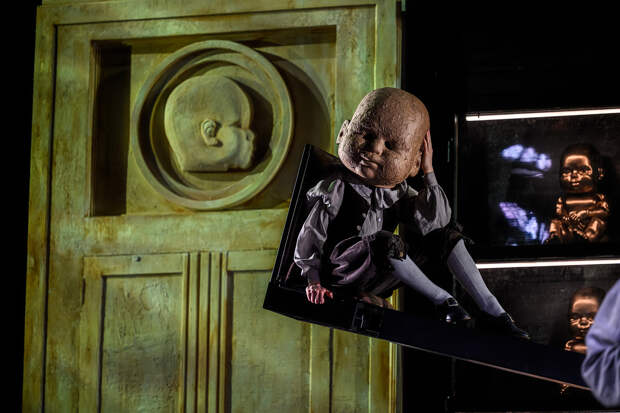 Весь вечер на сцене в той или иной форме присутствуют гигантские младенческие головы. Это сценографическое решение, очевидно, навеяно работами китайского художника Дона Шубина и его скульптурами «Сын Земли». Это вроде бы интересно, как и двигающийся сценический портал, как и четыре разных занавеса, но не складывается в единую картину оформления. Как и весь спектакль не складывается в единую мозаику, хотя её части кажутся вполне выразительными. Но они будто бы наслаиваются, а не создают картину.