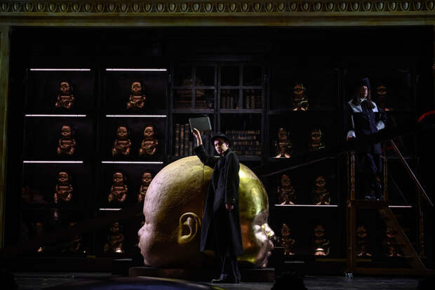 Весь вечер на сцене в той или иной форме присутствуют гигантские младенческие головы. Это сценографическое решение, очевидно, навеяно работами китайского художника Дона Шубина и его скульптурами «Сын Земли». Это вроде бы интересно, как и двигающийся сценический портал, как и четыре разных занавеса, но не складывается в единую картину оформления. Как и весь спектакль не складывается в единую мозаику, хотя её части кажутся вполне выразительными. Но они будто бы наслаиваются, а не создают картину.