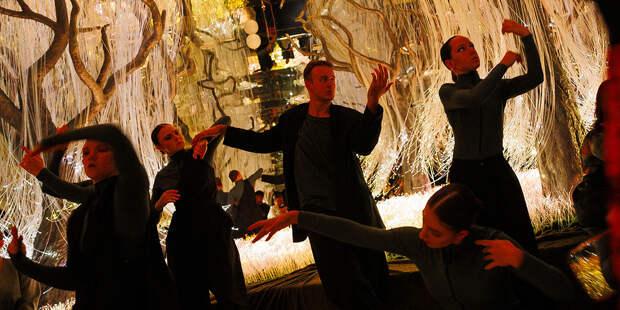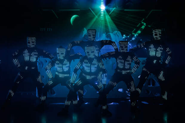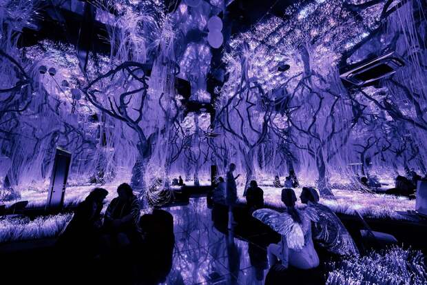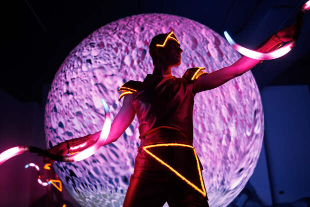 Первый зал Futurione Emotions называется «Волшебный лес» — здесь оживают декорации, будто придуманные визуализаторами Джеймса Кэмерона. Переливающаяся трава и световые деревья из оптоволокна переносят зрителя на планету из другой галактики.
