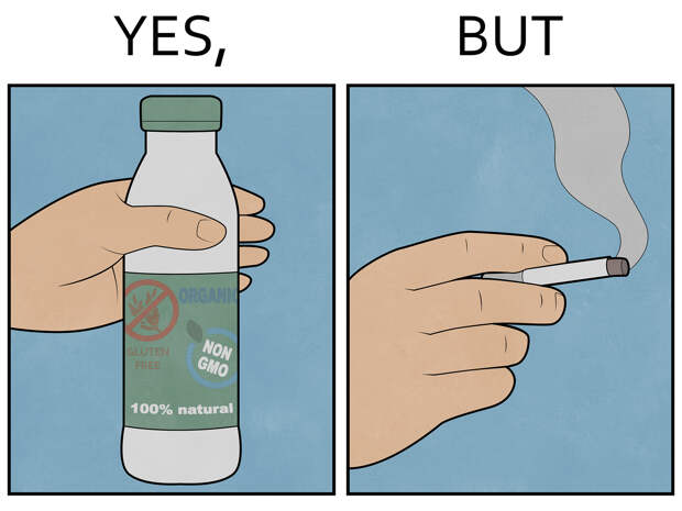 Из разных источников: соцсетей, высказываний людей, личных наблюдений. Со временем мой мозг уже настроился так, что я — хочу или не хочу — начинаю видеть “Yes, but” буквально везде. Например, дорогой автомобиль с номером 666, на зеркале которого висит распятие. Таких ситуаций много.