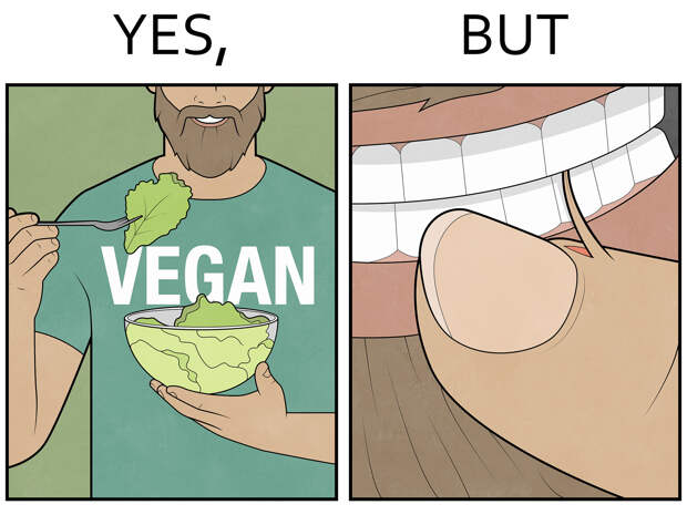 Я использую эти инструменты иногда без повода, просто как тренировку, а иногда мне хочется что-то донести, какую-то личную боль свою. Некоторые рисунки “Yes, but” — про то, как устроен мир вокруг нас и непосредственно вокруг меня.